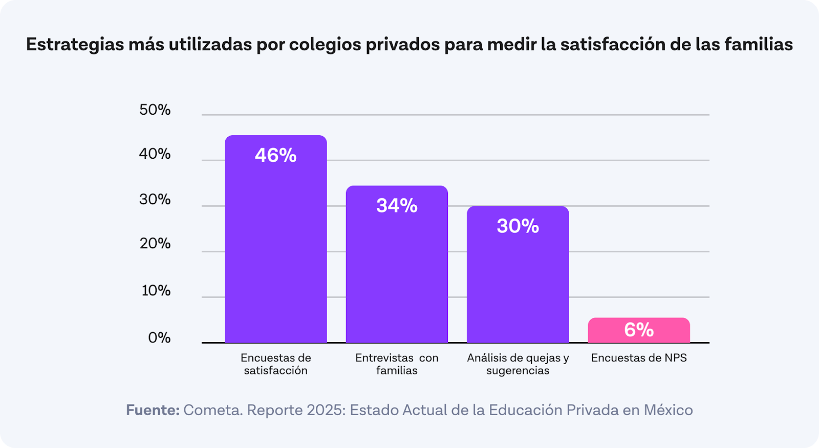 Pese a su simplicidad y potencia, como vimos anteriormente, solo el 6% de los colegios reporta utilizar esta herramienta. Esto representa una oportunidad, ya que el NPS no solo ofrece una lectura rápida del clima general, sino que, al ser un estándar ampliamente usado en otras industrias y sectores, permite entender mejor qué tan bien estamos en comparación con referentes conocidos. A diferencia de encuestas desarrolladas internamente —que a veces son largas, difíciles de responder o de interpretar— el NPS facilita respuestas honestas y procesables, sin abrumar a las familias.